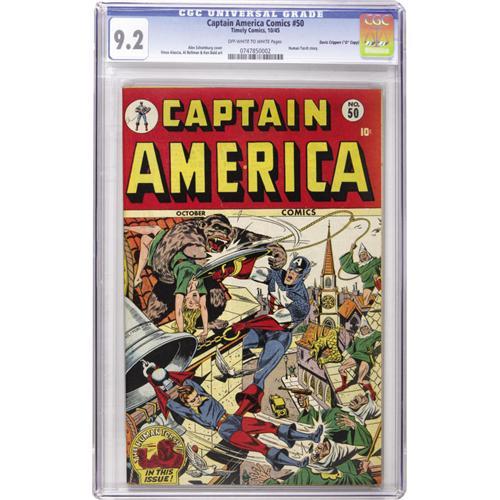This copy's super-sharp and a great showcase for an unusual Alex Schomburg cover. If you collect those gorilla covers, maybe it's time to add a Timely to your DC-heavy hoard, but expect a lot of competition for this NM- specimen. Overstreet 2006 NM- 9.2 value = $1,950. CGC census 12/06: 2 in 9.2, none higher.<BR><BR><b>Shipping:</b> Slabbed Comic (<a target="_blank" href="http://www.heritageauctions.com/common/shipping.php">view shipping information</a>)