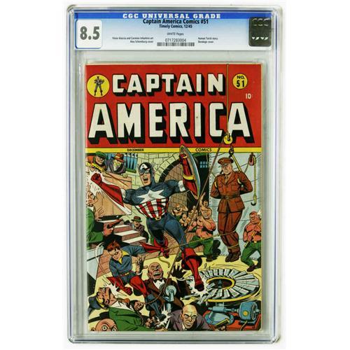 <B>Captain America Comics #51 (Timely, 1945) CGC VF+ 8.5 White pages.</B></I> Alex Schomburg's cover illustration shows a rather nasty-looking device about to slice and dice a hog-tied Army officer. Good thing Captain America and Bucky were close by! This cover illustration appears to have been a left-over from World War II, modified by Schomburg after the war ended. CGC notes it as a "bondage cover" (for the male officer), a designation we prefer to leave for situations involving members of the fairer sex. Inside, there's art by Carmine Infantino, and a Human Torch story. This exceptional copy appears fresh and tight. Overstreet 2005 VF 8.0 value = $863; VF/NM 9.0 value = $1,332. CGC census 11/05: 3 in 8.5, 3 higher.