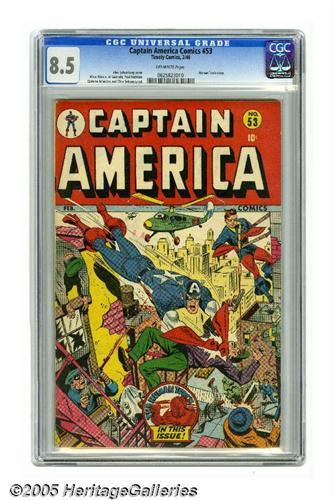 <B>Captain America Comics #53 (Timely, 1946) CGC VF+ 8.5 Off-white pages.</B></I> Bucky shooting a bad guy in the face? See for yourself on this Alex Schomburg cover. The issue has a Human Torch story in addition to multiple Cap adventures. Overstreet 2005 VF 8.0 value = $863; VF/NM 9.0 value = $1,332. CGC census 6/05: 1 in 8.5, 4 higher.