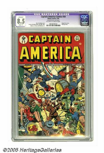 <B>Captain America Comics #54 (Timely, 1946) CGC Apparent VF+ 8.5 Slight (P) Off-white to white pages.</B></I> Don't let the restoration tag fool you on this magnificent masterpiece: CGC notes: "Restoration includes: cover cleaned." That's all, folks! This honey of a copy features an Alex Schomburg bondage cover (set inside an early television studio), as well as a Human Torch tale inside. Listed among the artists for this issue are Carmine Infantino, Mike Sekowsky, and Al Avison. Overstreet 2005 GD 2.0 value = $138; VG 4.0 value = $276; FN 6.0 value = $414; VF 8.0 value = $863.