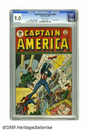 <B>Captain America Comics #56 (Timely, 1946) CGC VF/NM 9.0 Off-white pages.</B></I> Cap busts up a bunch of bad guys who are raiding the museum -- hey, watch those paintings! Fast action fun from your friends at Timely, including Syd Shores, Don Rico, Carmine Infantino, and Al Gabriele. The Human Torch is featured in this issue as well. Overstreet 2005 VF/NM 9.0 value = $1,332; NM- 9.2 value = $1,800. CGC census 7/05: 4 in 9.0, 4 higher.