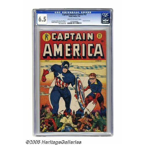 <B>Captain America Comics #57 (Timely, 1946) CGC FN+ 6.5 Cream to off-white pages.</B></I> This Cap outing has a Vince Alascia cover, with interior art by Al Avison, Jim Mooney, Carmine Infantino, and Bob Powell. There's also a Human Torch backup feature. Overstreet 2005 FN 6.0 value = $414; VF 8.0 value = $863. CGC census 8/05: 1 in 6.5, 14 higher. <BR><BR><B>Important notice:</B> Heritage usually auctions material at the rate of 200-250 lots per hour. On some occasions eBay Live bid software or the Internet may not be able to keep up with the pace of the auction. We recommend placing a realistic absentee bid now as insurance to avoid disappointment. Occasionally the auctioneer may eliminate or reject an eBay Live bid, and the auctioneer may also reopen a lot after the close of the eBay live bidding (usually because we missed an audience bid), and may reject your bid even if it shows you as the winning bidder. By bidding via eBay Live, you agree that Heritage may award the lot to another bidder at its sole discretion under the circumstances described above or any other reasonable circumstances. Since eBay bids are not shown to us until we open the lot on the floor, we treat those bids just like floor bids. In most cases the floor responds before the eBay bid is presented to us, due to Internet lag time, so for consistency we have made it a policy that floor bids are always considered first over tie eBay live bids. Also please note that all Heritage lots purchased through eBay Live carry a 20% Buyer's Premium. Please make sure you read the Terms and Conditions before you bid. This lot is being auctioned in conjunction with a live floor auction by Heritage Galleries & Auctioneers. All final auction and invoice information will be supplied by Heritage Galleries & Auctioneers, and all other information should be considered preliminary. Lot:2006 <BR><BR><B>Winning Notification and Billing:</B> After the FINAL session in this auction is complete, Heritage will send e-mai