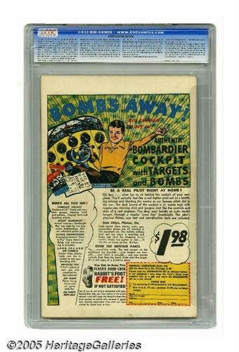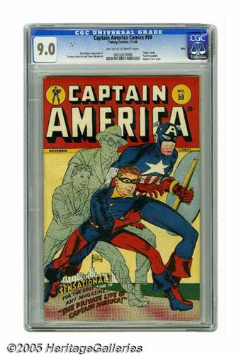 <B>Captain America Comics #59 Ohio pedigree (Timely, 1946) CGC VF/NM 9.0 Off-white to white pages.</B></I> Issues of <B>Captain America Comics</B></I> are a hot property, and this issue ranks among the top five in demand. It features a retelling of Cap's origin and a great cover by the legendary Syd Shores. Graded a 9.0, it's also one of the nicest copies to be had. Overstreet 2005 VF/NM 9.0 value = $3,185; NM- 9.2 value = $4,400. CGC census 6/05: 1 in 9.0, 4 higher.