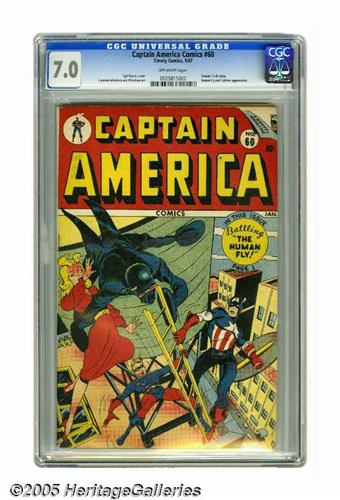 <B>Captain America Comics #60 (Timely, 1947) CGC FN/VF 7.0 Off-white pages.</B></I> Cap and Bucky take on the Human Fly (not to be confused with the Bronze Age superhero of the same name) in this issue. There's also a Human Torch story with Carmine Infantino art. The cover is by Syd Shores. Overstreet 2005 FN 6.0 value = $414; VF 8.0 value = $863. CGC census 5/05: 1 in 7.0, 8 higher.