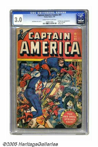 <B>Captain America Comics #61 (Timely, 1947) CGC GD/VG 3.0 Cream to off-white pages.</B></I> Syd Shores pulls out the stops with this bondage cover that also guest stars Cap's arch-nemesis, the Red Skull. A Human Torch story is featured in this issue. Overstreet 2005 GD 2.0 value = $281; VG 4.0 value = $562. CGC census 6/05: 1 in 3.0, 11 higher.