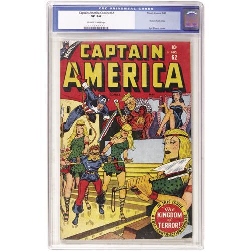 <B>Captain America Comics #62 (Timely, 1947) CGC VF 8.0 Off-white to white pages.</B></I> Syd Shores handled cover art chores here. Gentlemen don't always prefer blondes, just axe Bucky... we mean <I>ask</B></I> Bucky! The Human Torch appears in a backup feature. Overstreet 2006 VF 8.0 value = $1,181. CGC census 3/07: 4 in 8.0, 7 higher.<BR><BR><b>Shipping:</b> Comics - Slabbed (certified) (<a target=""_blank"" href=""http://www.heritageauctions.com/common/shipping.php"">view shipping information</a>)
