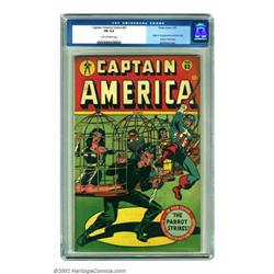 Captain America Comics #63 (Timely, 1947) CGC FN 6.0 Tan to off-white pages. Syd Shores with this eye-magnet cover gives us a villain whose punk haircut would later inspire Rod Stewart and Billy Idol. The man was far ahead of his time. This issue includes the origin and first appearance of Asbestos Lady, and another Human Torch story by Al Avison. Overstreet 2002 FN 6.0 value = $505. Important notice: We expect to be auctioning lots at the rate of 200-250 per hour. Sometimes eBay Premier live bid software cannot keep up with that pace, so we strongly recommend that you place a realistic proxy bid now as insurance to avoid disappointment. Also please note that all Heritage/CAA lots purchased through eBay Premier carry a 20% Buyer's Premium. Please make sure you read the Terms and Conditions.