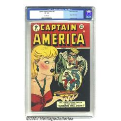 Captain America Comics #64 (Timely, 1947) CGC VF 8.0 Off-white pages. Syd Shores works his magic on this wild cover, which finds Cap and Bucky reflected in the compact mirror of a shapely young lass. Inside, there's a Human Torch story to be found. CGC currently notes only two copies of issue #64 which grade higher than this black-cover beauty. Overstreet 2003 VF 8.0 value = $1,063. Important notice: Heritage usually auctions material at the rate of 200-250 lots per hour. On some occasions eBay Live bid software or the Internet may not be able to keep up with the pace of the auction. We recommend placing a realistic absentee bid now as insurance to avoid disappointment. Occasionally the auctioneer may eliminate or reject an eBay Live bid, and the auctioneer may also reopen a lot after the close of the eBay live bidding (usually because we missed an audience bid), and may reject your bid even if it shows you as the winning bidder. By bidding via eBay Live, you agree that Heritage may award the lot to another bidder at its sole discretion under the circumstances described above or any other reasonable circumstances. Since eBay bids are not shown to us until we open the lot on the floor, we treat those bids just like floor bids. In most cases the floor responds before the eBay bid is presented to us, due to Internet lag time, so for consistency we have made it a policy that floor bids are always considered first over tie eBay live bids. Also please note that all Heritage lots purchased through eBay Live carry a 20% Buyer's Premium. Please make sure you read the Terms and Conditions before you bid.