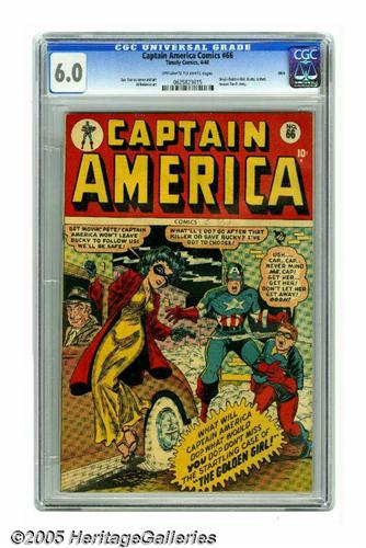 <B>Captain America Comics #66 Ohio pedigree (Timely, 1948) CGC FN 6.0 Off-white to white pages.</B></I> A key moment in Cap's career takes place here, as Bucky Barnes is shot, leading to the need for a replacement as Cap's sidekick. The hero's new helper is none other than supporting character Betsy Ross (sometimes called <I>Betty</B></I> Ross), who becomes Golden Girl for the first time in this issue, and even finds out Cap's secret identity. Note that the highest-graded copy of this origin issue in CGC's census to date is a 7.5, leaving our offering right up there with the best. Overstreet 2005 FN 6.0 value = $624. CGC census 6/05: 1 in 6.0, 3 higher.