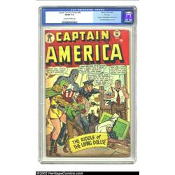 Captain America Comics #68 "D" Copy pedigree (Timely, 1948) CGC FN/VF 7.0 Cream to off-white pages. With no more Nazis or Japanese Imperialists to fight, Timely called on some new gimmicks to sell comic books. Bring on the girls! Captain America teams up with Golden Girl, and Sub-Mariner combos with Namora in this issue. This pedigree copy comes sooo close to the highest-grade ("7.5") CGC has assigned to date to an issue #68. Overstreet 2002 FN 6.0 value = $519; VF 8.0 value = $1,080. Important notice: We expect to be auctioning lots at the rate of 200-250 per hour. Sometimes eBay Premier live bid software cannot keep up with that pace, so we strongly recommend that you place a realistic proxy bid now as insurance to avoid disappointment. Also please note that all Heritage/CAA lots purchased through eBay Premier carry a 20% Buyer's Premium. Please make sure you read the Terms and Conditions.