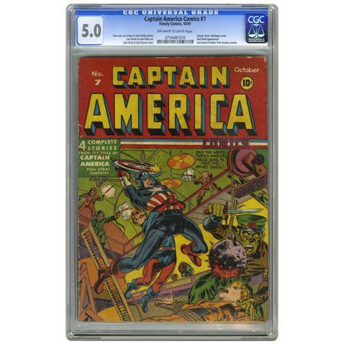 <B>Captain America Comics #7 (Timely, 1941) CGC VG/FN 5.0 Off-white to white pages.</B></I> This classic bondage cover is credited to Jack Kirby and Syd Shores, and inside the book, the Simon and Kirby team handled the art. The Red Skull is back to menace Cap, by the way. It's been a couple of years since we've seen this issue in any condition; don't miss this chance to grab an installment of Simon and Kirby's memorable ten-issue <B>Cap</B></I> run. Overstreet 2006 VG 4.0 value = $1,272; FN 6.0 value = $1,908. CGC census 4/06: 1 in 5.0, 12 higher.