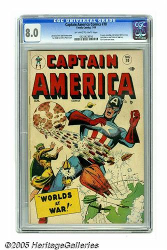 <B>Captain America Comics #70 (Timely, 1949) CGC VF 8.0 Off-white to white pages.</B></I> No copy of this white-cover issue has been graded higher by CGC to date! If you're like us, you're fascinated by these final days of the Timely superhero books, it's evident that the publisher was trying to stop lagging sales by experimenting with genre hybrids. Here, Cap and his new sidekick Golden Girl have a science fiction adventure, as previewed on the cover by Al Avison. There's also a Sub-Mariner backup feature with a Namora appearance. Overstreet 2005 VF 8.0 value = $1,225. CGC census 6/05: 1 in 8.0, none higher.