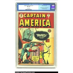 Captain America Comics #71 (Timely, 1949) CGC FN+ 6.5 Off-white pages. These latter day '40s issues are more uncommon than nearly all previous issues according to Gerber's The Photo-Journal Guide to Comic Books. We believe it! Not one copy of issue #71 has earned a grade higher than "7.5". Don Rico's cover previews the Cap/Golden Girl teamup awaiting inside. Overstreet 2002 FN 6.0 value = $519. Important notice: We expect to be auctioning lots at the rate of 200-250 per hour. Sometimes eBay Premier live bid software cannot keep up with that pace, so we strongly recommend that you place a realistic proxy bid now as insurance to avoid disappointment. Also please note that all Heritage/CAA lots purchased through eBay Premier carry a 20% Buyer's Premium. Please make sure you read the Terms and Conditions.