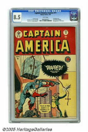 <B>Captain America Comics #71 (Timely, 1949) CGC VF+ 8.5 White pages.</B></I> Here's the highest-graded copy yet certified of this late Cap issue. The book is notable for having an editorial criticizing Fredric Wertham of <B>Seduction of the Innocent</B></I> fame. In addition to the Cap stories, there's a backup feature with the Witness from <B>Mystic Comics</B></I>. The cover is by Al Avison. Overstreet 2005 VF 8.0 value = $1,225; VF/NM 9.0 value = $1,888. CGC census 6/05: 1 in 8.5, none higher.