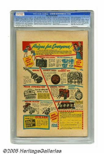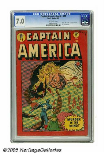 <B>Captain America Comics #72 (Timely, 1949) CGC FN/VF 7.0 Off-white pages.</B></I> One of the scarcer issues in the run -- Gerber gives it a "7." This is currently the highest-graded copy that CGC has certified. Golden Girl and Trickster make appearances, and a Witness story is featured. Overstreet 2005 FN 6.0 value = $588; VF 8.0 value = $1,225. CGC census 5/05: 1 in 7.0, none higher.