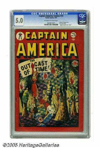 <B>Captain America Comics #73 (Marvel, 1949) CGC VG/FN 5.0 Off-white to white pages.</B></I> Looks like our good Captain is up to his neck in trouble on this bizarre cover, for the story "The Outcast of Time!" By the next issue, Cap would run out of time himself: the title changed to <B>Captain America's Weird Tales</B></I>, leaving the battle-weary crime-fighter ousted in favor of the "next big thing" -- horror comics. Overstreet 2005 VG 4.0 value = $392; FN 6.0 value = $588. CGC census 6/05: 1 in 5.0, 7 higher.