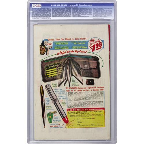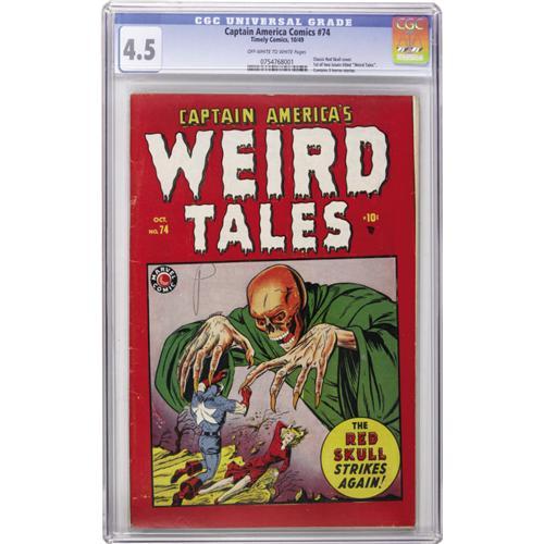 <B>Captain America Comics #74 (Timely, 1949) CGC VG+ 4.5 Off-white to white pages.</B></I> "Seekers of a copy of <B>Cap</B></I> #74 are urged to prepare for nail-biting, possible hair loss, and fits of depression" was how <B>Comic Book Marketplace</B></I> summed up the scarcity of this title. That same publication ranked the issue #2 for "most difficult to find" <I>and</B></I> "highest-demand" among all non-key Timely issues. If anything, it's time to re-think that "non-key" designation, as this is Cap's last Golden Age appearance -- #75 had Cap in the title but no appearance by him, and that was all for Cap until 1954's brief superhero revival. The Red Skull, meanwhile, wasn't seen again in comics until <B>Tales of Suspense</B></I> #65 a decade and a half later! And this horror-tinged cover remains one of the best Red Skull covers ever, if not <I>the</B></I> best. We could go on and on... just bid on it, 'nuff said! Overstreet 2006 VG 4.0 value = $1,128. CGC census 10/06: 2 in 4.5, 11 higher.<BR><BR><b>Shipping:</b> Slabbed Comic (<a target="_blank" href="http://www.heritageauctions.com/common/shipping.php">view shipping information</a>)