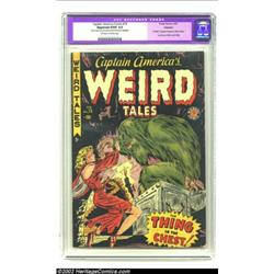 Captain America Comics #75 (Timely, 1950) CGC Apparent GD/VG 3.0 Off-white to white pages. The second of two issues titled Captain America's Weird Tales rates as a "scarce" book in The Photo-Journal Guide to Comic Books. The legendary series would end with this issue until a short revival in 1954. Of this copy CGC notes, "Bottom staple cleaned. (Right and bottom edge trimmed)" Overstreet 2002 GD 2.0 value = $173; FN 6.0 value = $519. Important notice: We expect to be auctioning lots at the rate of 200-250 per hour. Sometimes eBay Premier live bid software cannot keep up with that pace, so we strongly recommend that you place a realistic proxy bid now as insurance to avoid disappointment. Also please note that all Heritage/CAA lots purchased through eBay Premier carry a 20% Buyer's Premium. Please make sure you read the Terms and Conditions.
