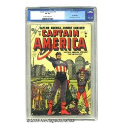 Captain America Comics #76 (Timely, 1954) CGC VF- 7.5 Off-white to white pages. Captain America and Bucky mark their return to comics with a triumphant John Romita Sr. cover. This is their first issue after a four-year layoff, but the Super Soldier and his sidekick would battle "Commies" for only three issues, before returning to limbo for another 10 years. Timely mainstays the Human Torch and Toro also get stories in this Atlas comic. To date, no other copies of this issue have been graded higher by CGC. Overstreet 2003 VF 8.0 value = $625. Important notice: Heritage usually auctions material at the rate of 200-250 lots per hour. On some occasions eBay Live bid software or the Internet may not be able to keep up with the pace of the auction. We recommend placing a realistic absentee bid now as insurance to avoid disappointment. Occasionally the auctioneer may eliminate or reject an eBay Live bid, and the auctioneer may also reopen a lot after the close of the eBay live bidding (usually because we missed an audience bid), and may reject your bid even if it shows you as the winning bidder. By bidding via eBay Live, you agree that Heritage may award the lot to another bidder at its sole discretion under the circumstances described above or any other reasonable circumstances. Since eBay bids are not shown to us until we open the lot on the floor, we treat those bids just like floor bids. In most cases the floor responds before the eBay bid is presented to us, due to Internet lag time, so for consistency we have made it a policy that floor bids are always considered first over tie eBay live bids. Also please note that all Heritage lots purchased through eBay Live carry a 20% Buyer's Premium. Please make sure you read the Terms and Conditions before you bid.
