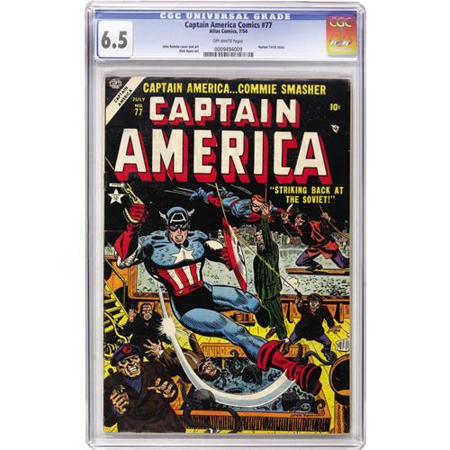 <B>Captain America Comics #77 (Timely, 1954) CGC FN+ 6.5 Off-white pages.</B></I> Former Nazi-busters Captain America and Bucky not only head for Russia here, there's even an anticommunist yarn set in Korea. John Romita Sr. drew the cover and the Cap stories, and there's also a Human Torch tale here. Note that the only copy graded higher is just half a notch above this one at 7.0. Overstreet 2006 FN 6.0 value = $312; VF 8.0 value = $650. CGC census 3/07: 1 in 6.5, 1 higher. <I> From the Warren Hall Collection.</B></I><BR><BR><b>Shipping:</b> Comics - Slabbed (certified) (<a target=""_blank"" href=""http://www.heritageauctions.com/common/shipping.php"">view shipping information</a>)