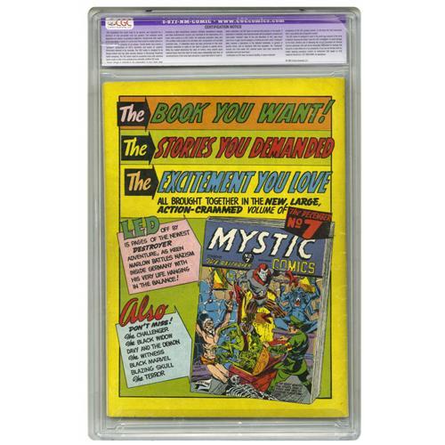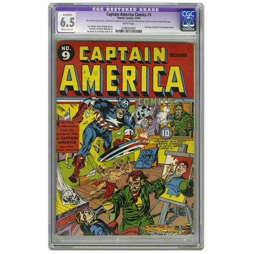 <B>Captain America Comics #9 (Timely, 1941) CGC Apparent FN+ 6.5 Moderate (P) White pages.</B></I> While this entire series is highly collectible, the first ten issues are the real gems, as those were the ones done by Captain America's creators, Simon and Kirby. This professionally restored copy would look nice in any run of early <B>Cap</B></I>s, and we tip our caps to you if you've put such a run together! CGC notes, "Restoration includes: cover cleaned, interior lightened, cover & centerfold reinforced, tear seal 5th page, piece replaced 23rd page." Overstreet 2006 GD 2.0 value = $448; VG 4.0 value = $896; FN 6.0 value = $1,344; VF 8.0 value = $3,136.
