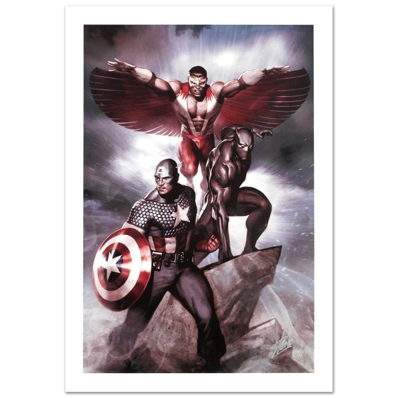 A piece of comic book history, this limited edition, from original art by Adi Granov, depicts a heroic Captain America, Black Panther, and Falcon. While working for Marvel, Adi Granov has drawn covers for Spider-Man, X-Men, and the Fantastic Four. Granov also helped design the Iron Man suit for the recent film adaptation. "Captain America: Hail Hydra #3" is a limited edition giclee on canvas by Adi Granov presented by Marvel Comics, numbered and hand signed by the great Stan Lee! Includes Certificate of Authenticity! Measures approx. 18" x 27" (image).