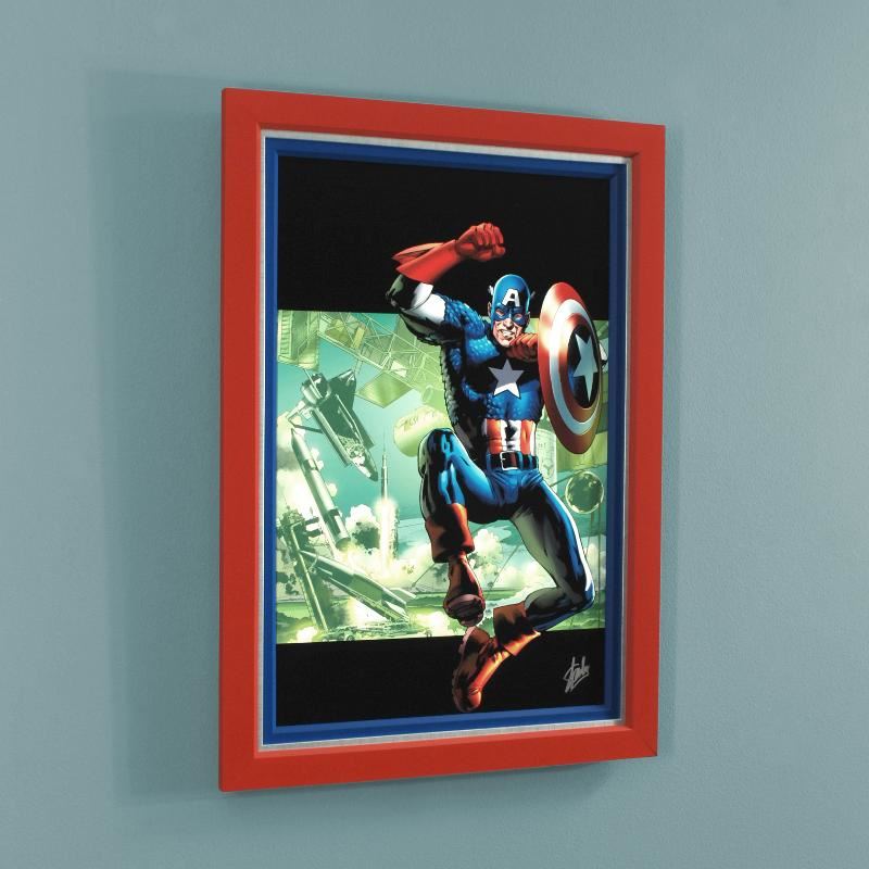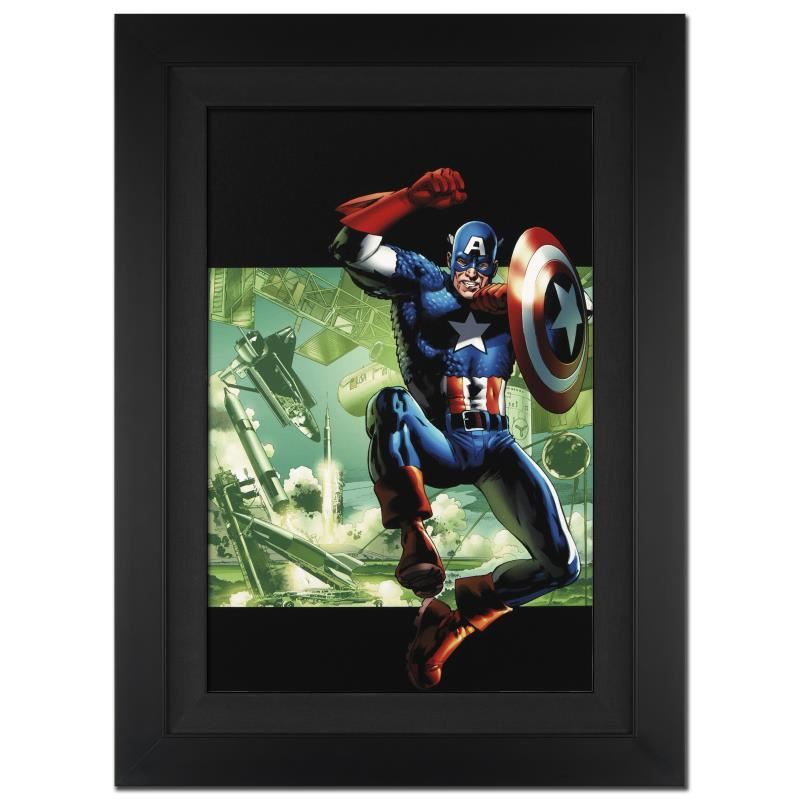 A piece of comic book history, this limited edition, from original art by Bryan Hitch, depicts the heroic Captain America. British artist Bryan Hitch was inspired by comic books at an early age. Not only has Hitch worked on the The Avengers, Captain America, and She-Hulk, but he also did the character design for the Ultimate Avengers and Ultimate Avengers 2 animated films. "Captain America: Man Out Of Time #4" is an extremely limited edition giclee on canvas by Bryan Hitch presented by Marvel Comics, hand signed by the Great Stan Lee (1922-2018) and numbered out of only 10! This piece was custom framed and ready to hang. Includes Certificate of Authenticity! Measures approx. 25" x 34" (with frame), 18" x 27" (image).