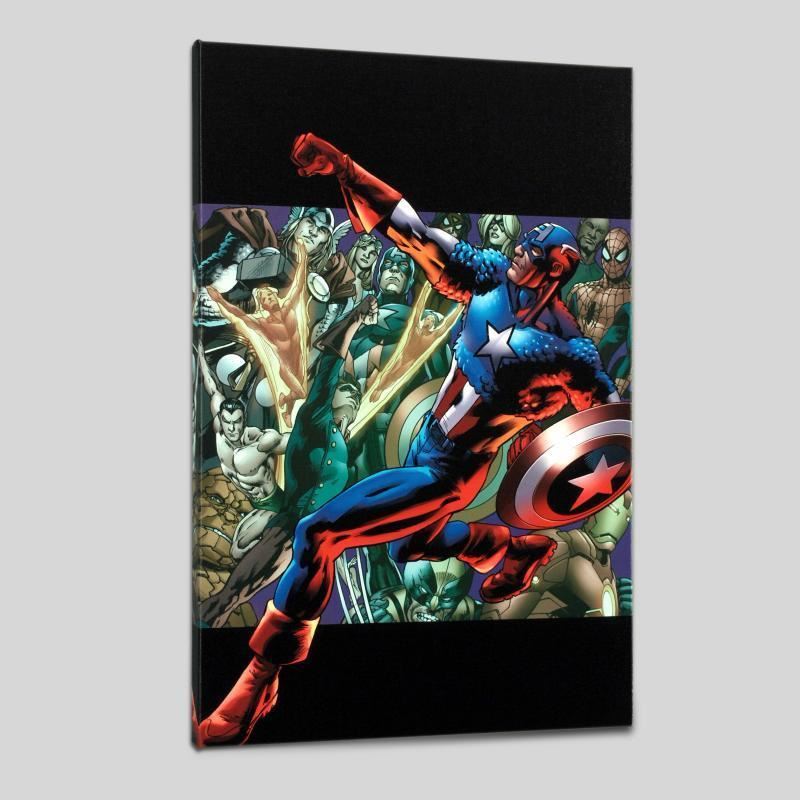A piece of comic book history, this limited edition, from original art by Bryan Hitch, depicts the heroic Captain America. British artist Bryan Hitch was inspired by comic books at an early age. Not only has Hitch worked on the The Avengers, Captain America, and She-Hulk, but he also did the character design for the Ultimate Avengers and Ultimate Avengers 2 animated films. "Captain America: Man Out Of Time #5" is a limited edition giclee on canvas by Bryan Hitch presented by Marvel Comics! This piece comes gallery wrapped. Includes Certificate of Authenticity! Measures approx. 18" x 27" (image); 1.5" (depth).