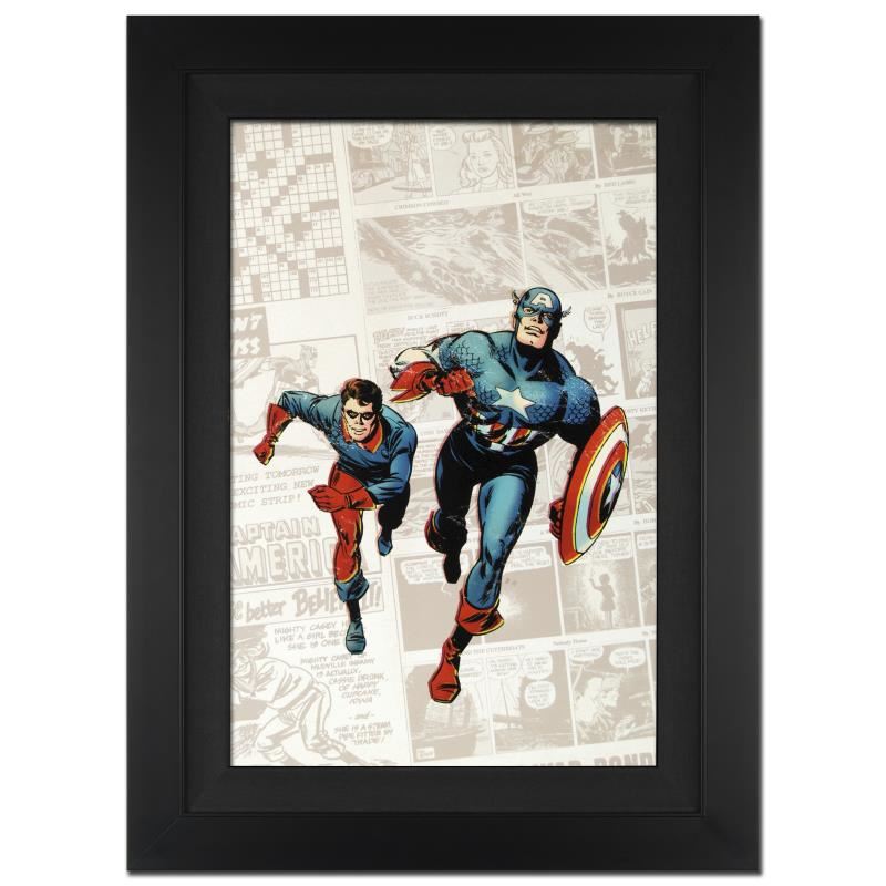 A piece of comic book history, this limited edition, from original art by Butch Guice, depicts the classic Captain America and his pal Bucky. Working in the comic industry since the 1980s, Jackson "Butch" Guice is known for his Marvel work on the X-Men and Captain America franchises. "Captain America: The 1940s Newspaper Strip #1" is an extremely limited edition giclee on canvas by Butch Guice presented by Marvel Comics, hand signed by the great Stan Lee and numbered out of only 10! This piece comes custom framed and ready to hang. Includes Certificate of Authenticity! Measures approx. 25" x 34" (with frame), 18" x 27" (image).