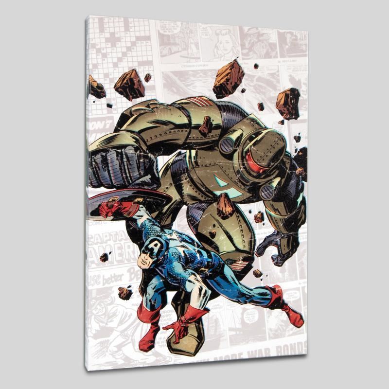 A piece of comic book history, this limited edition, from original art by Butch Guice, depicts the classic Captain America. Working in the comic industry since the 1980s, Jackson "Butch" Guice is known for his Marvel work on the X-Men and Captain America franchises. "Captain America: The 1940s Newspaper Strip #2" is a limited edition numbered giclee on stretched canvas by Butch Guice presented by Marvel Comics. This piece comes gallery wrapped. Includes Certificate of Authenticity! Measures approx. 18" x 27" (image); 1.5" (depth).