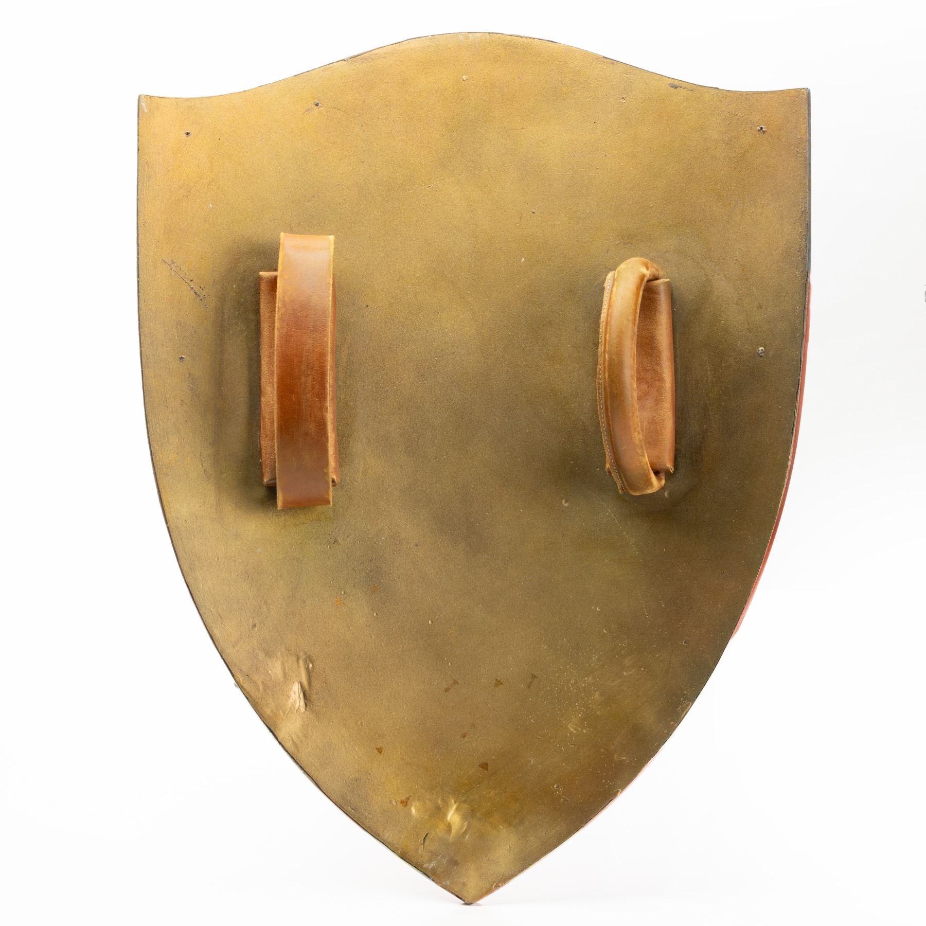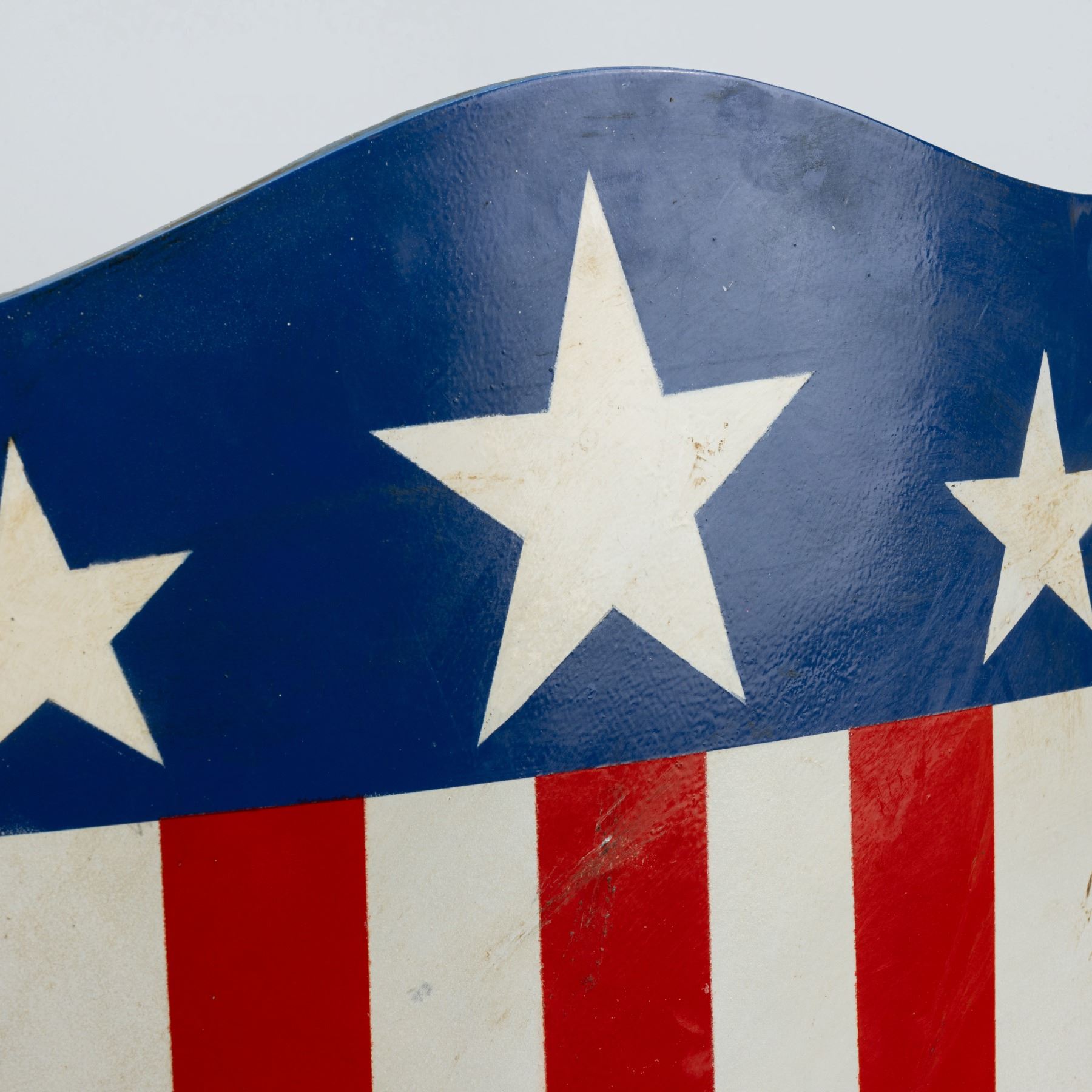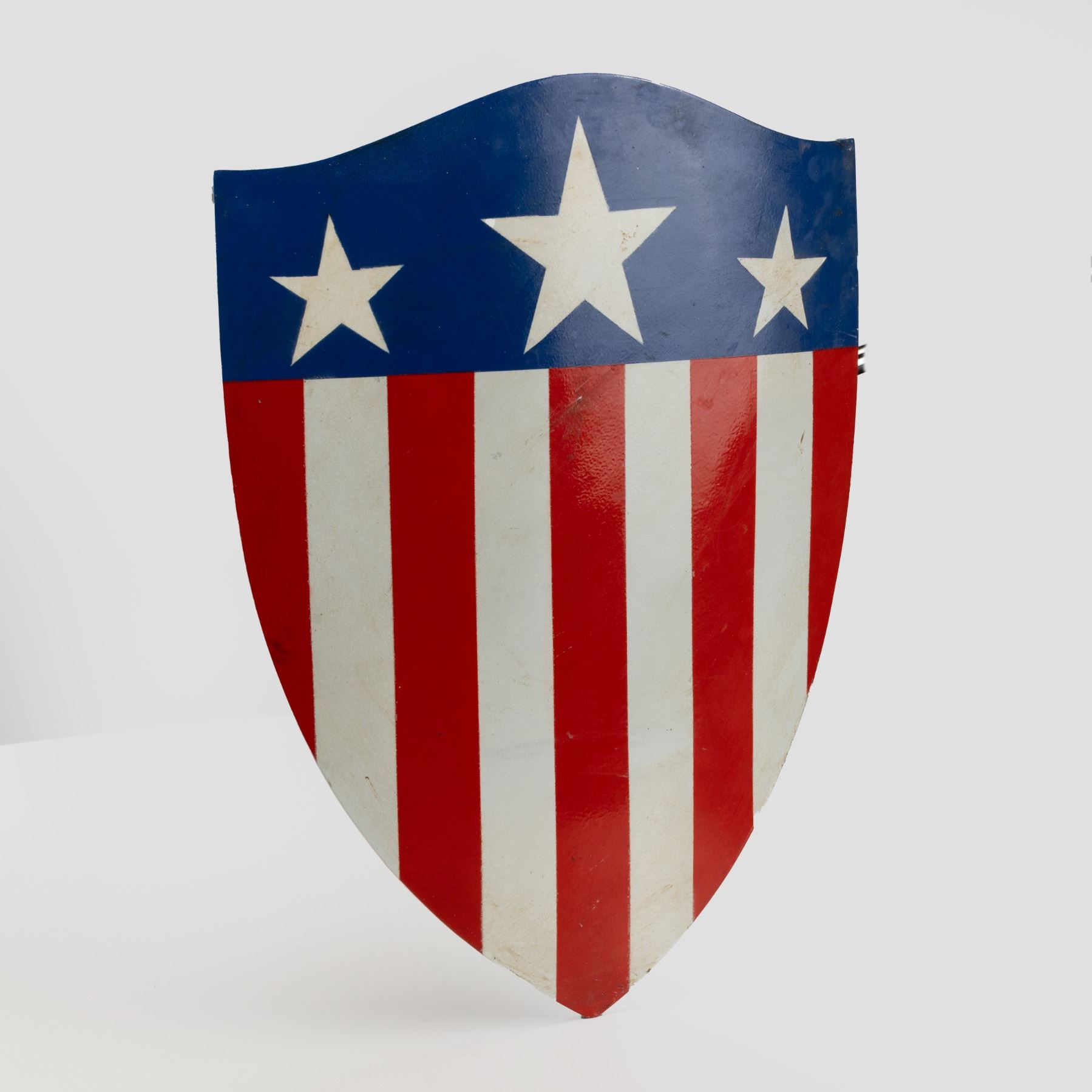 Original USO style shield used inn the production of the hit 2011 Marvel Studios superhero film Captain America: The First Avenger. It is 1941 and the world is in the throes of war. Steve Rogers (Chris Evans) wants to do his part and join America's armed forces, but the military rejects him because of his small stature. Finally, Steve gets his chance when he is accepted into an experimental program that turns him into a supersoldier called Captain America. Joining forces with Bucky Barnes (Sebastian Stan) and Peggy Carter (Hayley Atwell), Captain America leads the fight against the Nazi-backed HYDRA organization.