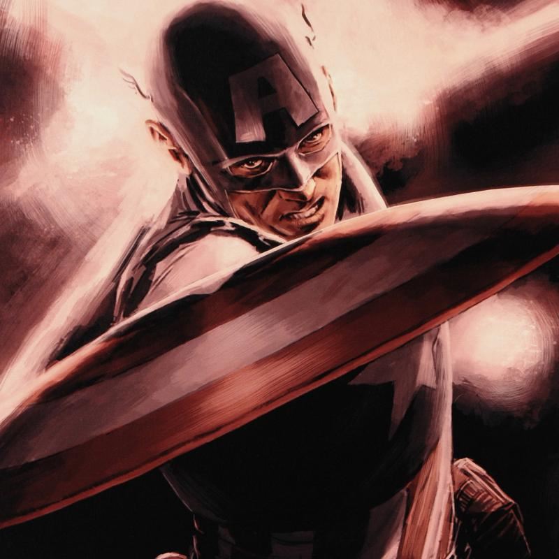 A piece of comic book history, this limited edition, from original art by Mitchell Breitweiser, depicts an iconic image of Captain America. Since 2005, Mitchell Breitweiser has been penciling, inking, and painting his way through dozens of Marvel comic books and covers. Mitch has left a lasting impression with his Captain America books, including 2010's Captain America: Patriot Mini Series. "Captain America Theater of War: A Brother in Arms #1" is a limited edition numbered giclee on canvas by Mitchell Breitweiser presented by Marvel Comics. This piece comes gallery wrapped and ready to hang. Includes Certificate of Authenticity! Measure approx. 18" x 27" (image).