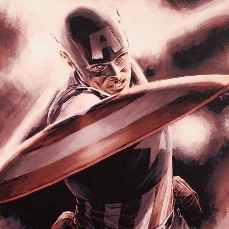 A piece of comic book history, this limited edition, from original art by Mitchell Breitweiser, depicts an iconic image of Captain America. Since 2005, Mitchell Breitweiser has been penciling, inking, and painting his way through dozens of Marvel comic books and covers. Mitch has left a lasting impression with his Captain America books, including 2010's Captain America: Patriot Mini Series. "Captain America Theater of War: A Brother in Arms #1" is a limited edition giclee on canvas by Mitchell Breitweiser presented by Marvel Comics, numbered and hand signed by the great Stan Lee! Includes Certificate of Authenticity! Measures approx. 18" x 27" (image).