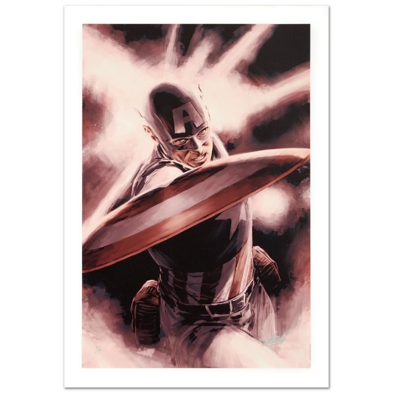 A piece of comic book history, this limited edition, from original art by Mitchell Breitweiser, depicts an iconic image of Captain America. Since 2005, Mitchell Breitweiser has been penciling, inking, and painting his way through dozens of Marvel comic books and covers. Mitch has left a lasting impression with his Captain America books, including 2010's Captain America: Patriot Mini Series. "Captain America Theater of War: A Brother in Arms #1" is a limited edition giclee on canvas by Mitchell Breitweiser presented by Marvel Comics, numbered and hand signed by the great Stan Lee! Includes Certificate of Authenticity! Measures approx. 18" x 27" (image).