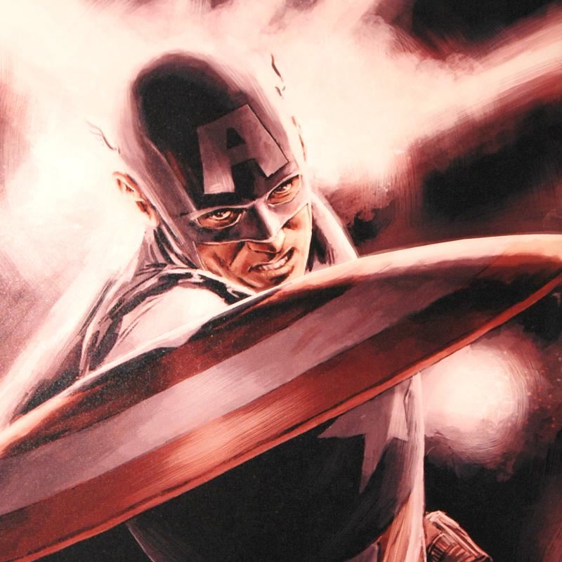 A piece of comic book history, this limited edition, from original art by Mitchell Breitweiser, depicts an iconic image of Captain America. Since 2005, Mitchell Breitweiser has been penciling, inking, and painting his way through dozens of Marvel comic books and covers. Mitch has left a lasting impression with his Captain America books, including 2010's Captain America: Patriot Mini Series. "Captain America Theater of War: A Brother in Arms #1" is a limited edition numbered giclee on canvas by Mitchell Breitweiser presented by Marvel Comics, hand signed by the Great Stan Lee (1922-2018) and numbered out of only 4! This piece has been custom framed and ready to hang. Includes Certificate of Authenticity! Measures approx. 29" x 40" (with frame); 22" x 33" (image).