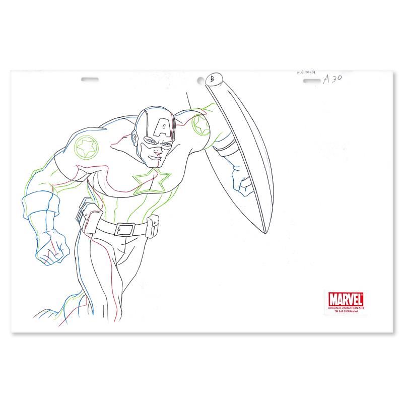 "Captain America" is an original production drawing on animation paper by Marvel Comics. Includes Letter of Authenticity. Measures approx. 14" x 10" (image).