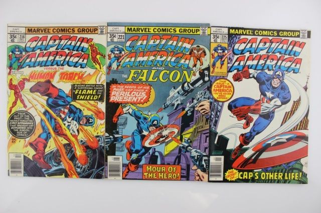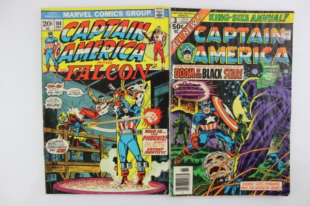 Marvels Captain America Comic lot, includes King Size Annual 3 #168,221,225,216 all comics are in good condition, minor cracks on the spine of each comic, pages are white to off white.