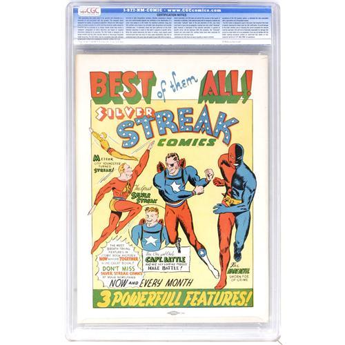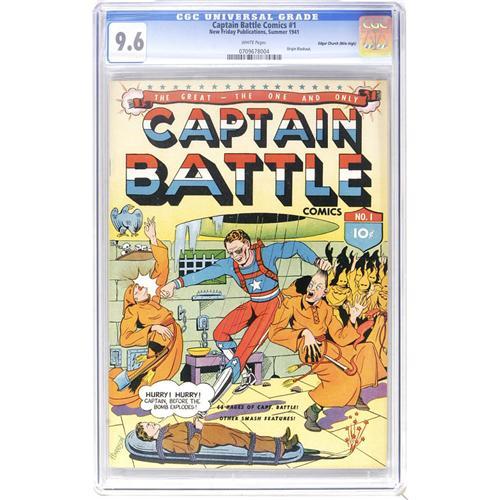 <B>Captain Battle Comics #1 Mile High pedigree (New Friday, 1941) CGC NM+ 9.6 White pages.</B></I> This Edgar Church copy looks simply amazing for a comic that's over 60 years old! The star is Captain Battle, who first appeared in <B>Silver Streak Comics</B></I> and has been called the third patriotic superhero after the Shield and Captain America. This premiere issue features the origin of Blackout, drawn by Don Rico. The cover art is by an artist with the catchy name of George Harrison! Overstreet 2006 NM- 9.2 value = $1,950. CGC census 5/06: 1 in 9.6, none higher. <BR><BR><B>Important notice:</B> Heritage usually auctions material at the rate of 200-250 lots per hour. On some occasions eBay Live bid software or the Internet may not be able to keep up with the pace of the auction. We recommend placing a realistic absentee bid now as insurance to avoid disappointment. Occasionally the auctioneer may eliminate or reject an eBay Live bid, and the auctioneer may also reopen a lot after the close of the eBay live bidding (usually because we missed an audience bid), and may reject your bid even if it shows you as the winning bidder. By bidding via eBay Live, you agree that Heritage may award the lot to another bidder at its sole discretion under the circumstances described above or any other reasonable circumstances. Since eBay bids are not shown to us until we open the lot on the floor, we treat those bids just like floor bids. In most cases the floor responds before the eBay bid is presented to us, due to Internet lag time, so for consistency we have made it a policy that floor bids are always considered first over tie eBay live bids. Also please note that all Heritage lots purchased through eBay Live carry a 22.5% Buyer's Premium. Please make sure you read the Terms and Conditions before you bid. This lot is being auctioned in conjunction with a live floor auction by Heritage Auction Galleries. All final auction and invoice information will be supplied by Heritage Auction Galleries, and all other information should be considered preliminary. Lot:41001 <BR><BR><B>Winning Notification and Billing:</B> After the FINAL session in this auction is complete, Heritage will send e-mail and snail mail invoices. This process normally takes several days. All final auction and invoice information will be supplied by Heritage Auction Galleries, and all other information should be considered preliminary. <BR><BR>This auction will be conducted on a live auction floor and over the Internet through eBay Live. If you choose to place an absentee bid, please take a moment to <font color='#0000ff'><u><a href='http://pages.ebay.com/liveauctions/help/before/laabsentee.html'>learn how eBay Live absentee bidding works</a></u></font><font color='#000000'>