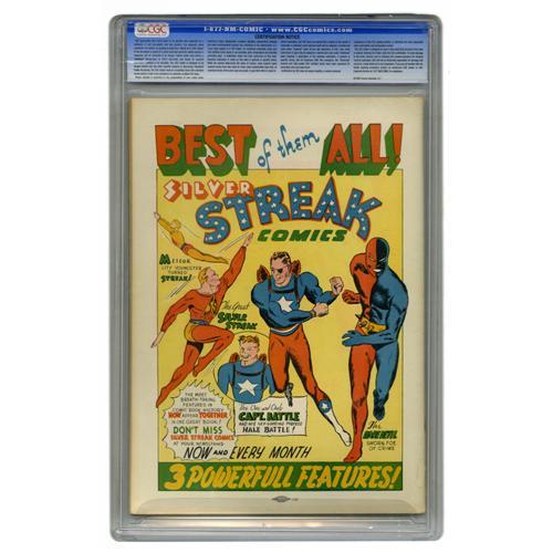 <B>Captain Battle Comics #1 (New Friday, 1941) CGC FN/VF 7.0 Cream to off-white pages.</B></I> Our undying affection for Golden Age comics is in no small part because of books like this one. No, cover art George Harrison was not a master draftsman, in fact he has the nuttiest use of perspective since M.C. Escher, and his grasp of anatomy would make Grey turn pale. But the energy in the art is too good to pass up! As for the title character, who was also a regular in <B>Silver Streak Comics</B></I>, you might accuse him of being a ripoff of better-known characters, but did any of those other Captains have an eyepatch? Did any of them use a "luceflyer" or a "dissolvo gun?" We think not. In his brilliant essay on Captain Battle in <B>Amazing Heroes</B></I> #26, Ron Goulart drolly noted that the series "was an alleged quarterly, appearing five times over a five-year period." Goulart credits the interior art to Frank Borth (best known for his work on the Christian <B>Treasure Chest</B></I> series) and George Mandel, who contributed to a number of publishers in the Golden Age. Overstreet 2006 FN 6.0 value = $432; VF 8.0 value = $900. CGC census 1/06: 2 in 7.0, 4 higher.