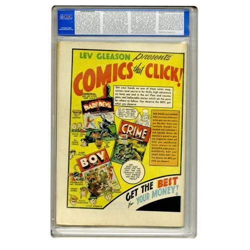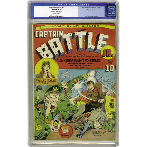<B>Captain Battle Jr. #1 Double Cover (Lev Gleason, 1943) CGC VF/NM 9.0 Off-white pages.</B></I> Don Rico provided the action-packed cover and interior art to this first issue. The interior features a story with The Claw vs. The Ghost. As far as first issues from the early 1940s go, this one is already a must-have, but throw in a double cover and you've got a true winner. CGC notes, "1st cover 8.0, interior cover 9.0." Overstreet 2006 VF/NM 9.0 value = $1,353; NM- 9.2 value = $1,850. CGC census 3/06: 1 in 9.0, 1 higher.