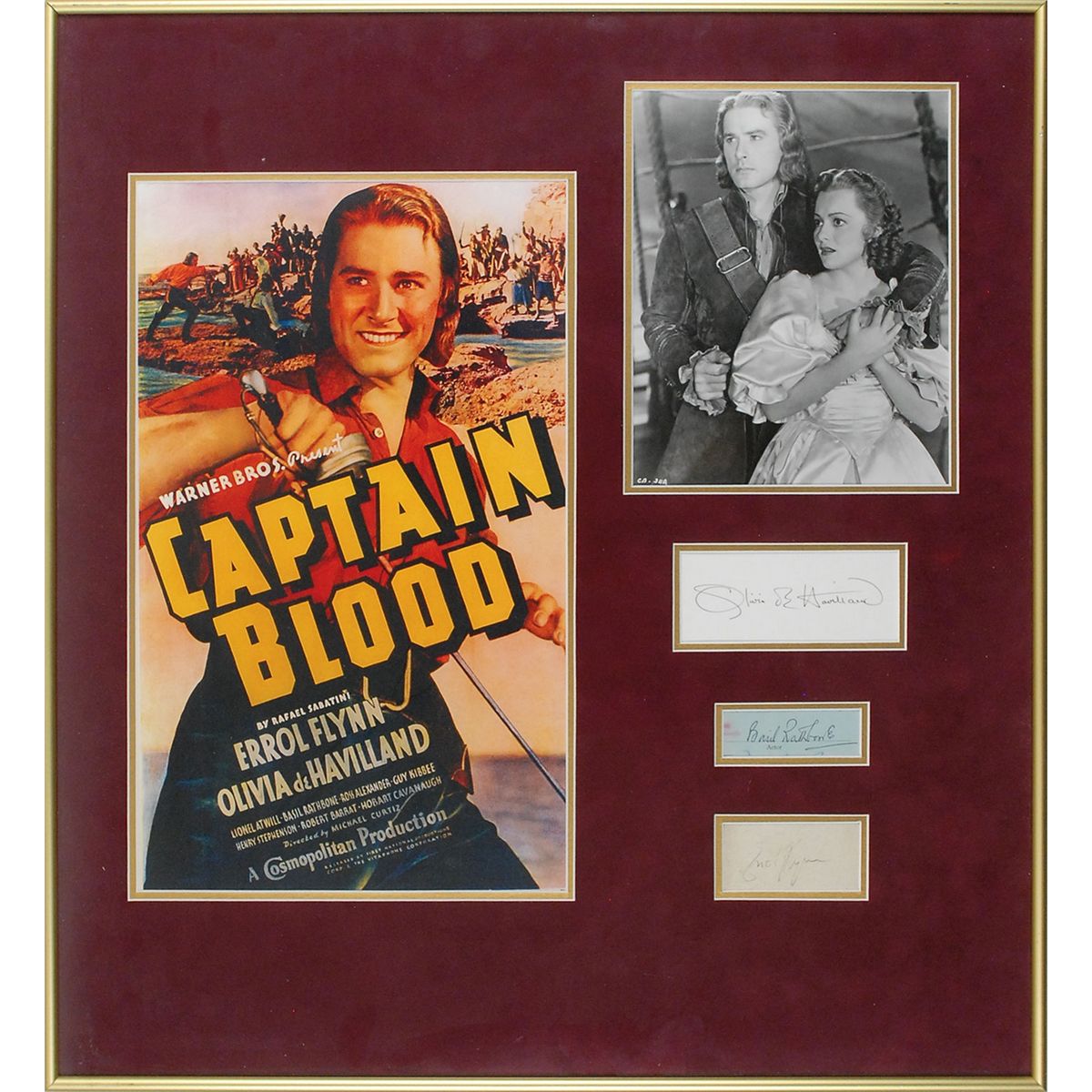 Ink signatures of Errol Flynn, Basil Rathbone, and Olivia de Havilland on individual cards and slips. All three are double-suede-matted and framed with a photo from the film and a small reproduction poster to an overall size of 22 x 24. In fine condition.