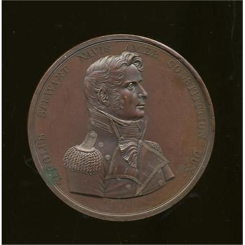 <B>Captain Charles Stewart Naval Medal, Julian-NA-22, Mint State Uncertified.</B></I> Bronzed copper, 65 mm, 125.5 gm. Dies by Moritz Furst. Obverse bust right, CAROLUS STEWART NAVIS AMER. CONSTITUTION DUX ("Charles Stewart captain of the American ship <I>Constitution), </B></I>FURST.F. below. Reverse naval battle scene, legend around and in exergue UNA VICTORIAM ERIPUIT RATIBUS BINIS / INTER CONSTITU. NAV. AMERI. ET LEVANT ET CYANE NAV. ANG. DIE XX FEBR. MDCCCXV ("He snatched victory from two vessels with one / Between the American warship <I>Constitution</B></I> and the British warships <I>Cyane</B></I> and <I>Levant,</B></I> February 20, 1815.), FURST.F. below.<BR> This is an attractive mahogany-brown, lustrous piece with cherry-red accents and prooflike surfaces, but there are a few noticeable carbon spots as well, the largest on the obverse rim at 8 o'clock. Both sides are struck from the original dies, diagnosed by a bar across the bottom of the T in FURST on the reverse, and broken rims on both sides (obverse from 12 to 3, reverse from 1 to 3 o'clock). One of 80 copper pieces minted. A specimen in the landmark Kessler-Spangenberger sale (NASCA, 4/1981, lot 1715) brought $210 against a presale estimate of $75.<BR><BR><b>Shipping:</b> Coins & Currency (<a target="_blank" href="http://www.heritageauctions.com/common/shipping.php">view shipping information</a>)