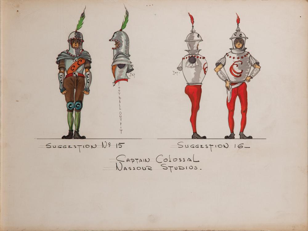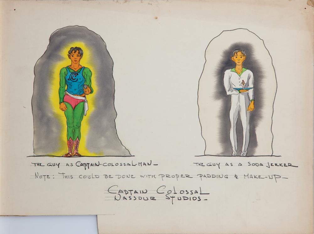 Pair of concept drawings on 15 in. x 20 in. illustration board, one with lower left corner removed. This well preserved concept art was rendered by John Datu Arensma for the Nassour studios for "Captain Colossal" in the 1950's. This live action feature was not produced, but captured the flavor of the times. Captain Colossal appears to be a super hero that lives among us, but avenges evil in his armored suit, fitted with a jet pack that gives him the ability to fly. This is a rare opportunity to own a piece of 1950's Hollywood history.