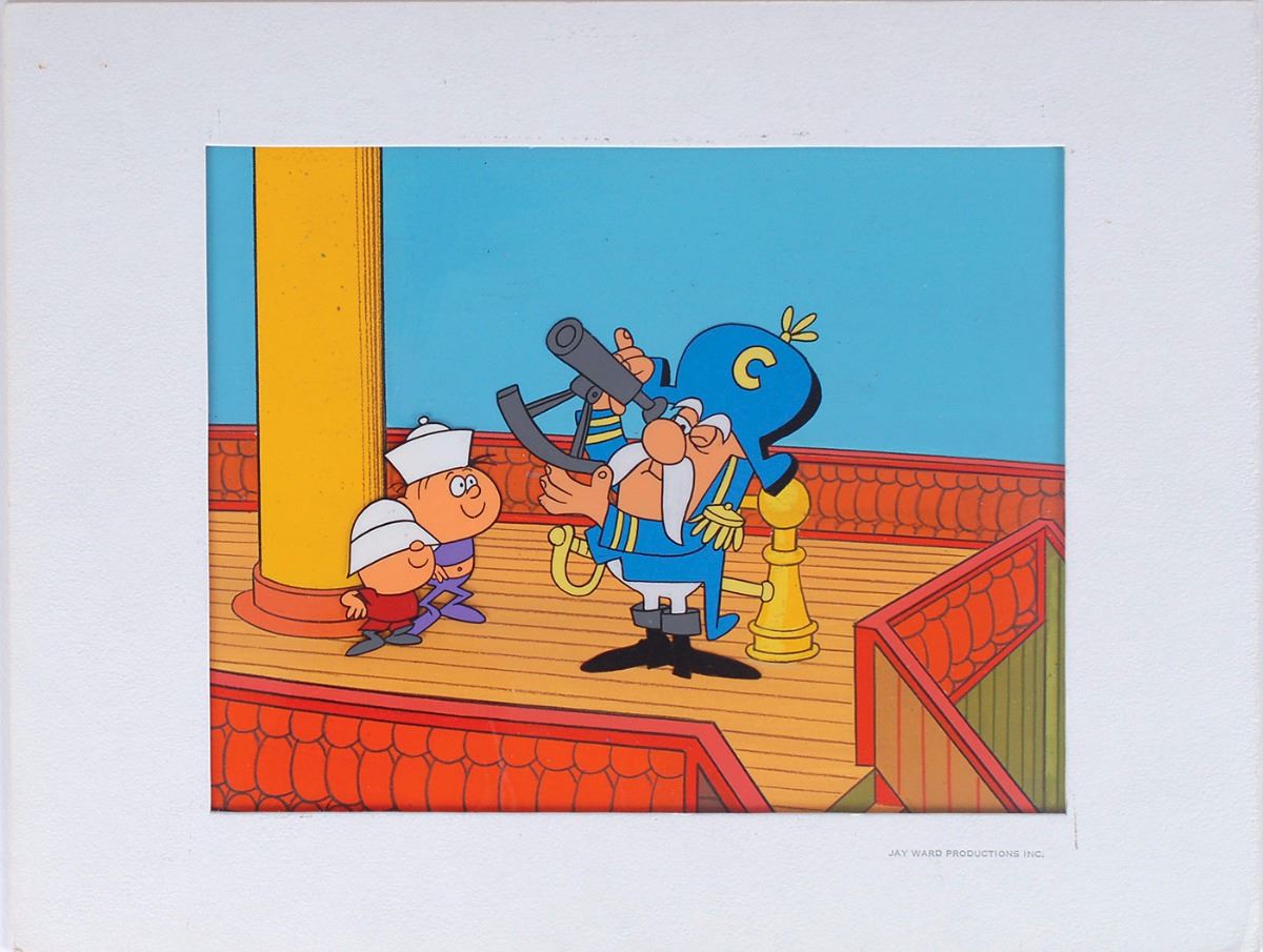 (Jay Ward Productions, circa 1980s) Original production key master background set-up featuring Captain Crunch with two sailors aboard his ship. The cel is placed on a matching hand-painted production background. Image measures 5 x 4, with a mat opening of 9 x 7. Original Jay Ward Productions mat measures 13 x 10. In fine condition, with light soiling to mat.