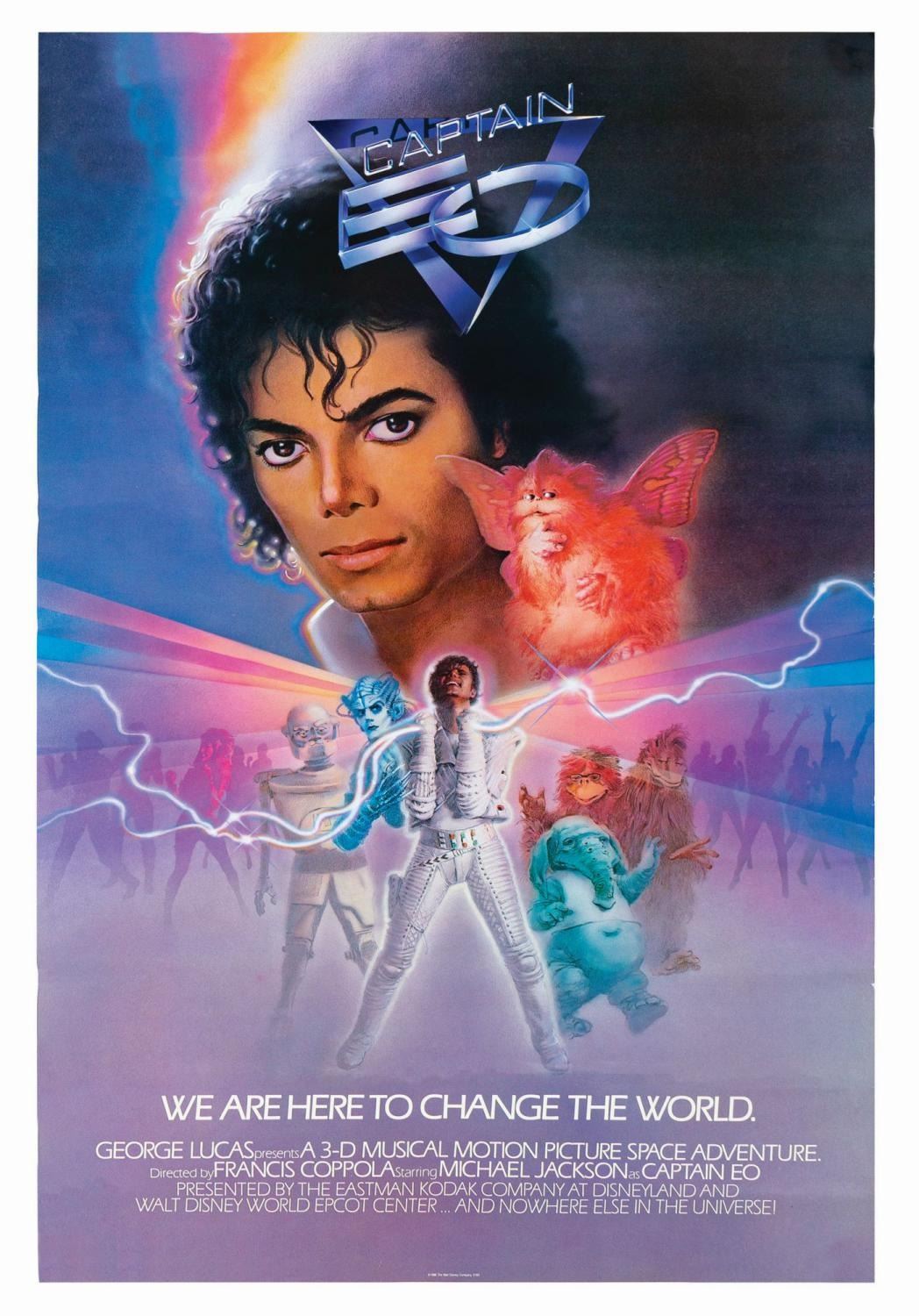 (Disneyland, 1986) An original Disneyland attraction poster for Captain EO. Directed by Francis Ford Coppola and starring Michael Jackson, the 17-minute-long 4D sci-fi attraction film also played at Walt Disney World, Tokyo Disneyland, and Euro Disneyland through 1996. Never folded, the poster measures 28.5"x18.5" and is in very good condition with some minor rippling from rolled storage.