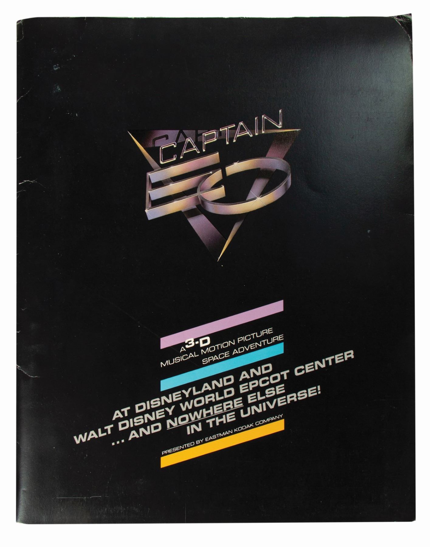 (Disneyland, 1986) A vintage press kit from the Galactic Premiere of Captain EO. Featuring extensive information and premiere-specific material, the kit includes a Captain EO folder, (6) gelatin silver RC photographs, (8) color 35MM slides, a fold-out 3-D poster of Jackson as EO, (6) stapled press release packets, a Captain EO Grand Opening information sheet, a Captain EO Premiere Party invitation, and a used Galactic Premiere of Captain EO complimentary silver press ticket. Measuring 12”x9.5”, the kit is in good condition. It exhibits some spidering, corner creases, and edge wear to the folder, some oxidation to press release staples, central crease to invitation, and general handling.