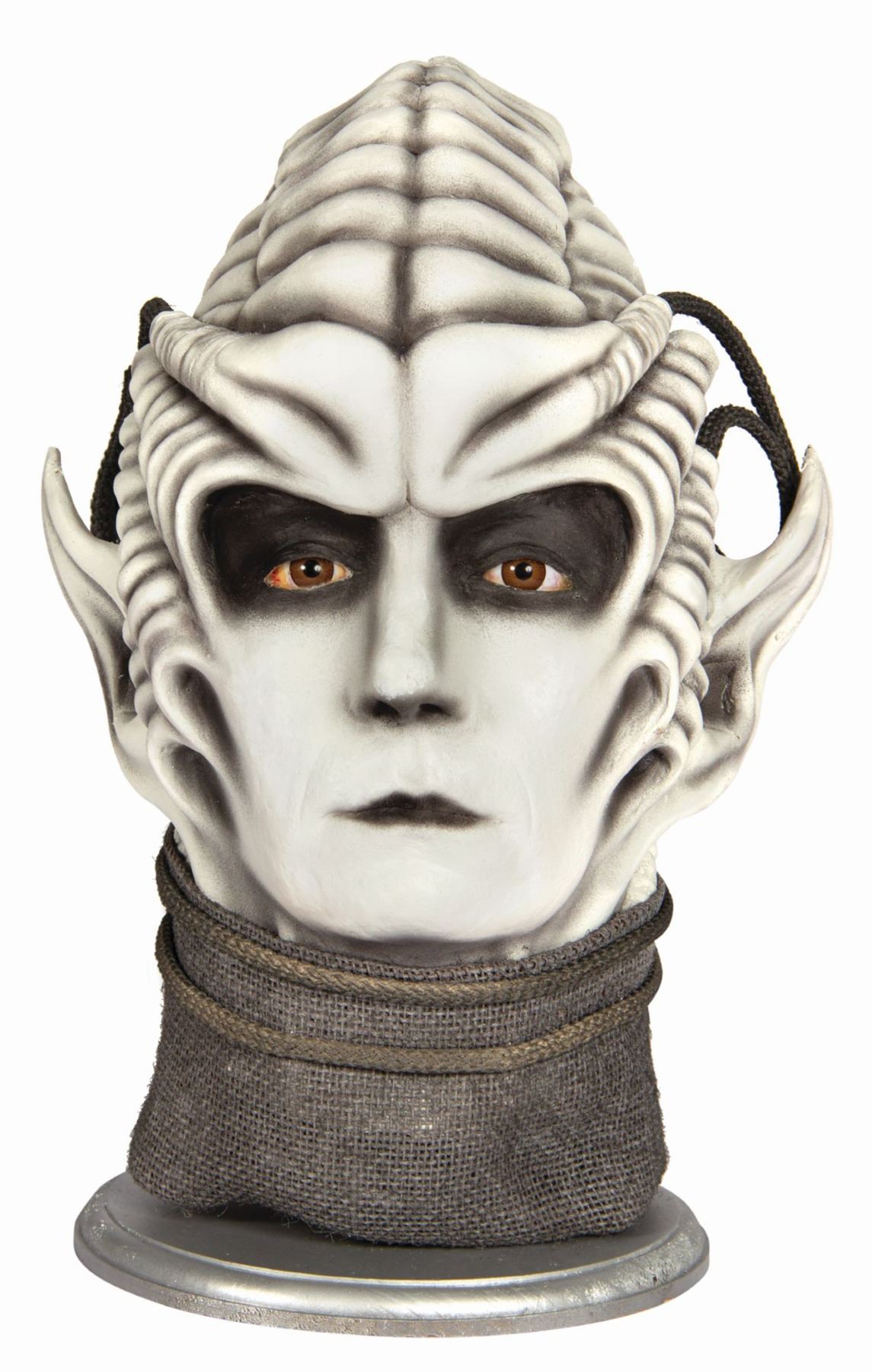 (Disneyland, 1986) A makeup test head for the Supreme Leader in Captain EO. The film played in Tomorrowland from 1986 to 1998 and returned for a few years in the 2010s following Michael Jackson's death. The head is created in foam with rope accents and demonstrates the makeup for the Supreme Leader (Anjelica Huston) in her original form, highlighting the lines of the prosthetic elements. Measuring approximately 15" tall on the stand, the head is in very good condition with some surface wear from use, including spots of wear to the paint.