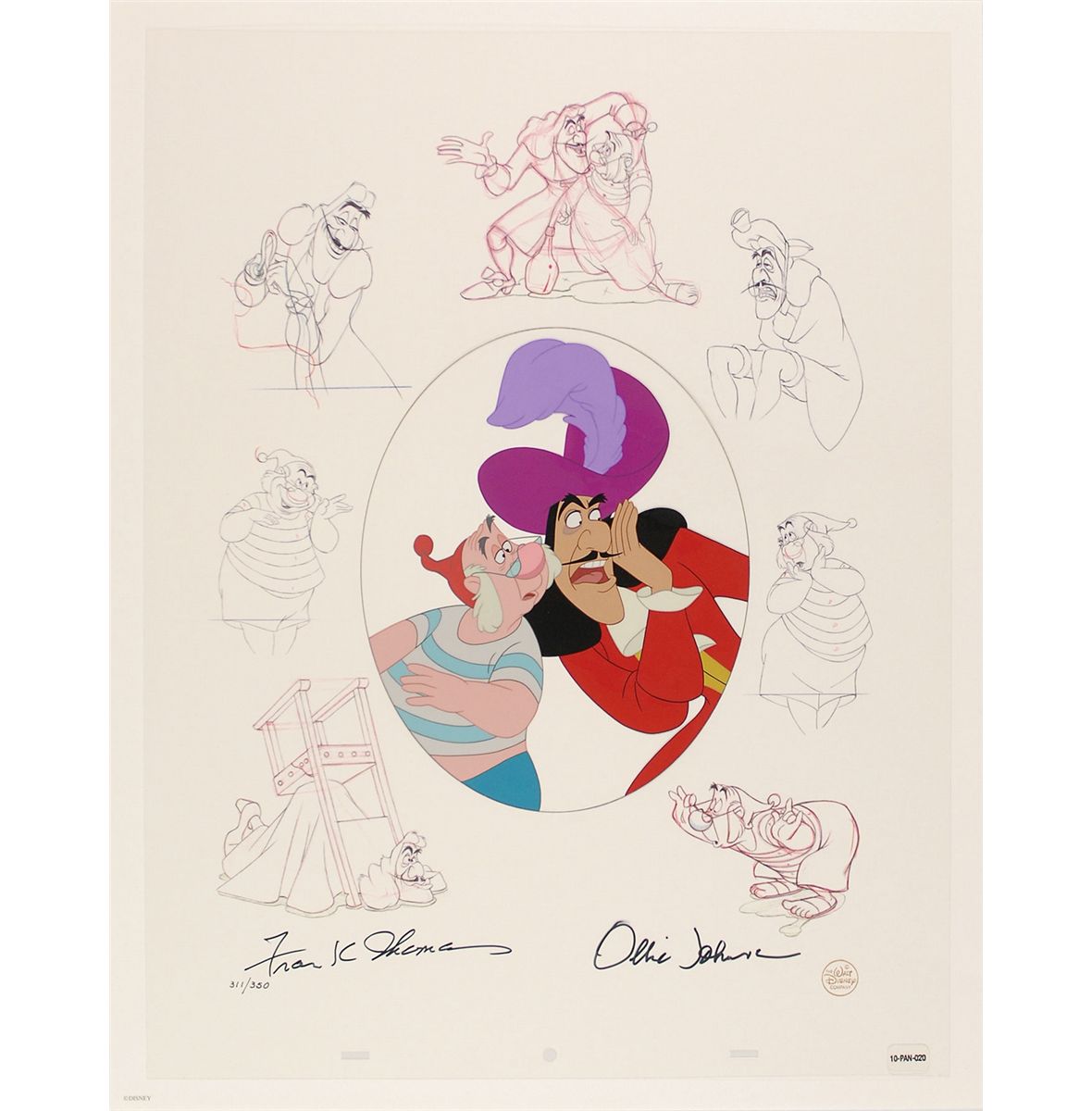 (Walt Disney Studios, 1995) Original Masters Series limited edition hand-painted cel featuring Captian Hook and Mr. Smee from Peter Pan, numbered 311/350, signed at the bottom in black felt tip by Frank Thomas and Ollie Johnston. The cel is placed on a lithographed background reproducing numerous clean-up production sketches from the film. Image measures 6.5 x 8.5, with a overall dimensions of 16 x 20. This piece has the Walt Disney Company seal on lower right and accompanying certificate of authenticity. In fine condition.