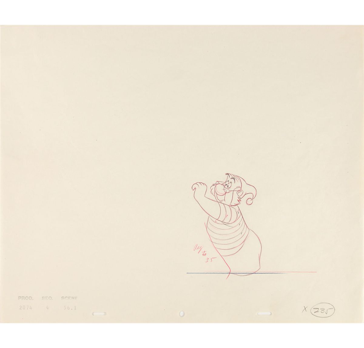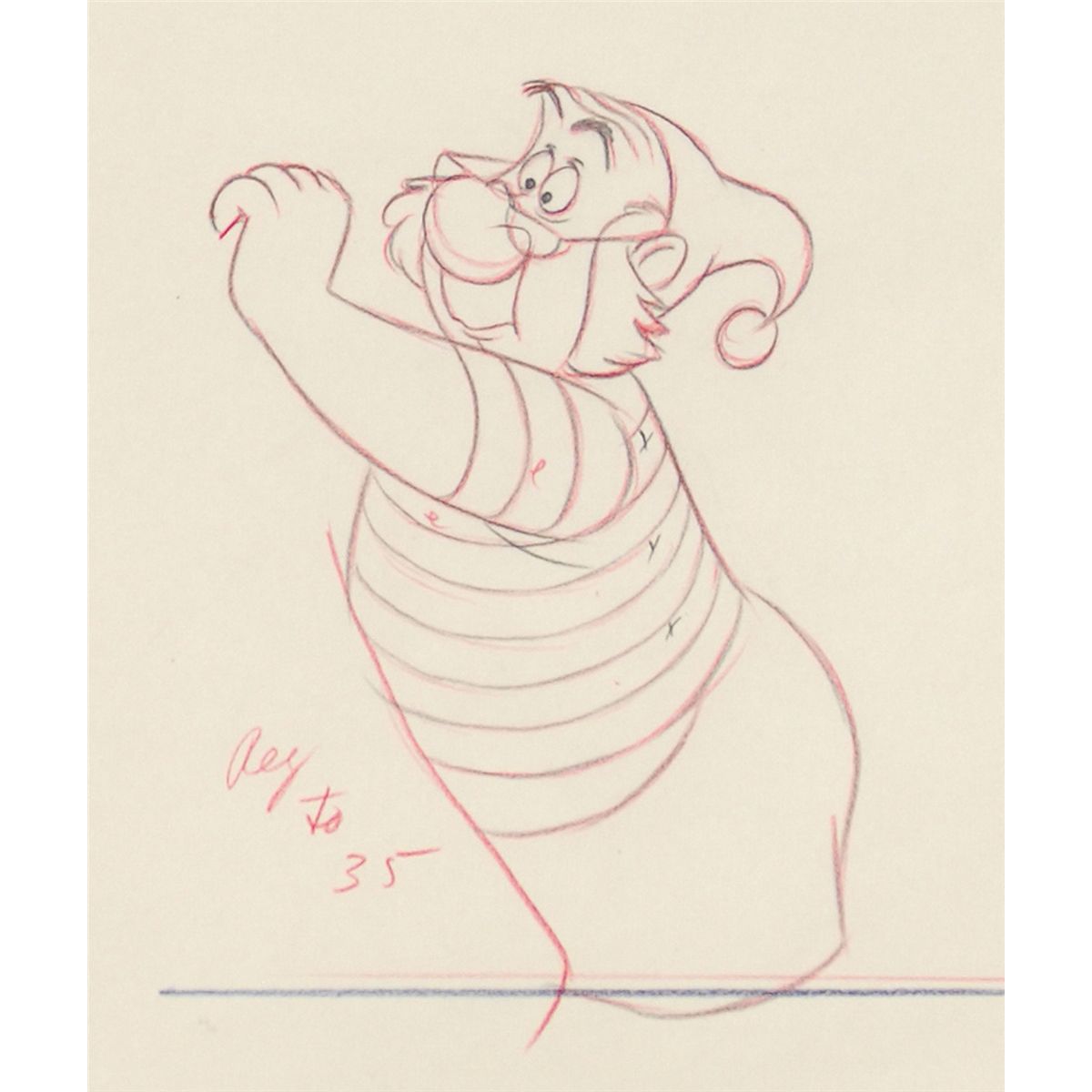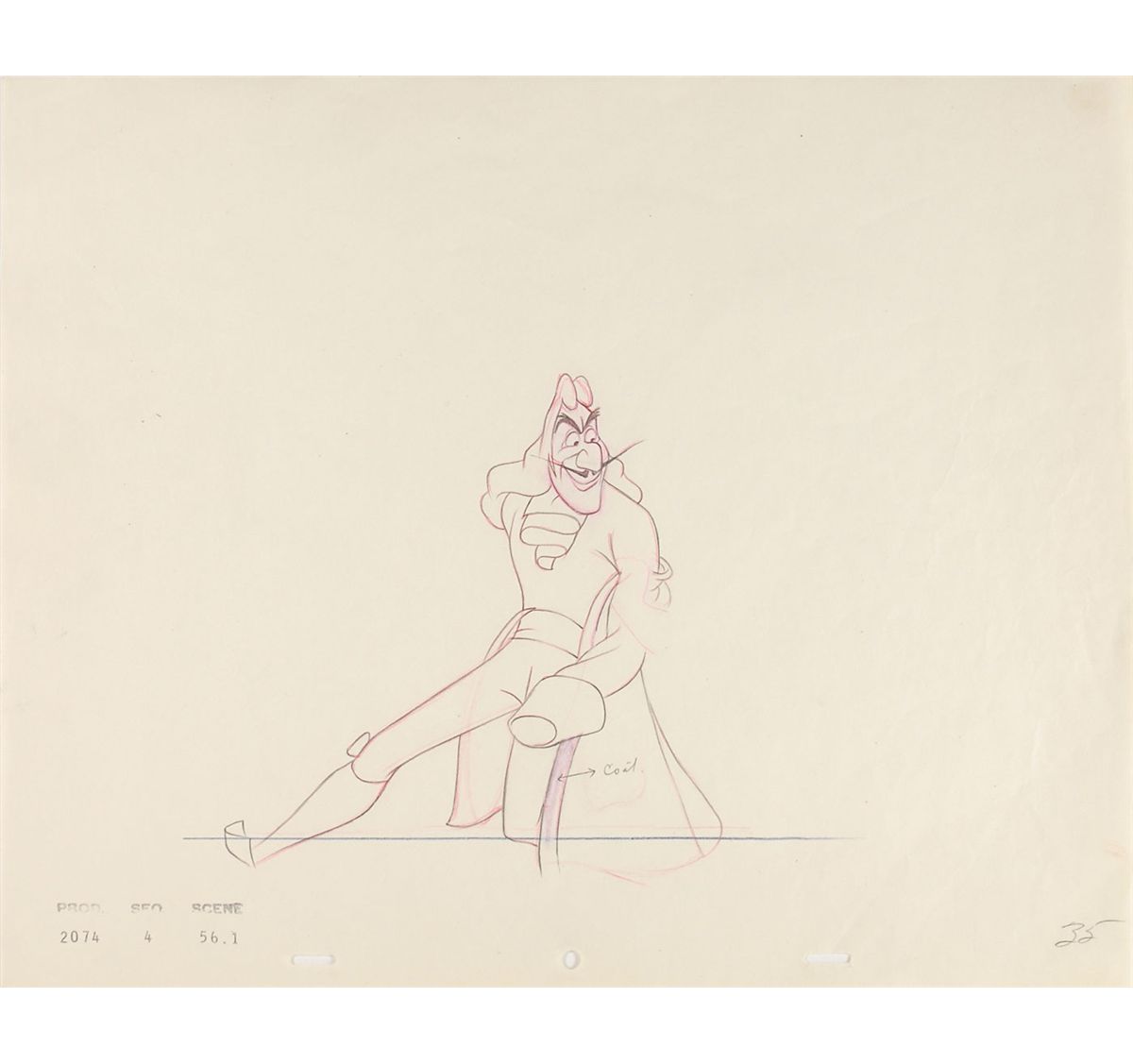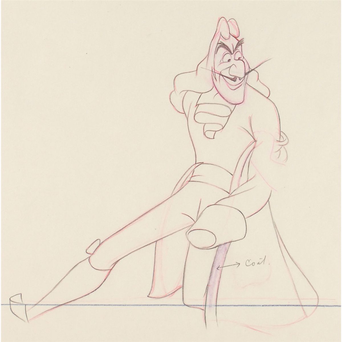 (Walt Disney Studios, 1953) Original matched set of two production drawings featuring Captain Hook and Mr. Smee from Peter Pan. Accomplished in graphite on two sheets of untrimmed 15.5 x 12.5 animation paper. Captain Hook image measures 7 x 6.25 and the Mr. Smee image measures 2.75 x 4. In fine condition.