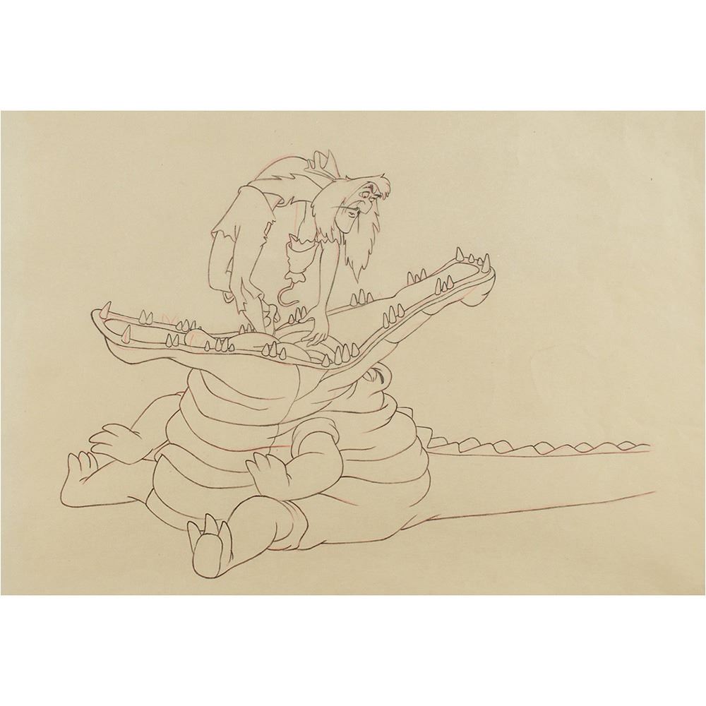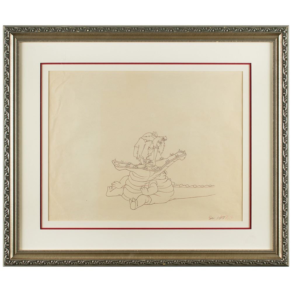 (Walt Disney Studios, 1953) Original production drawing featuring Captain Hook and Tick-Tock the Crocodile from Peter Pan, showing the swashbuckling pirate atop the croc's wide open mouth. Accomplished in graphite and colored pencil on 14.75 x 11.5 animation paper, marked "Sc 107" in the lower right. Image measures 8.5 x 6. Framed to an overall size of 22 x 18.75. In fine condition.